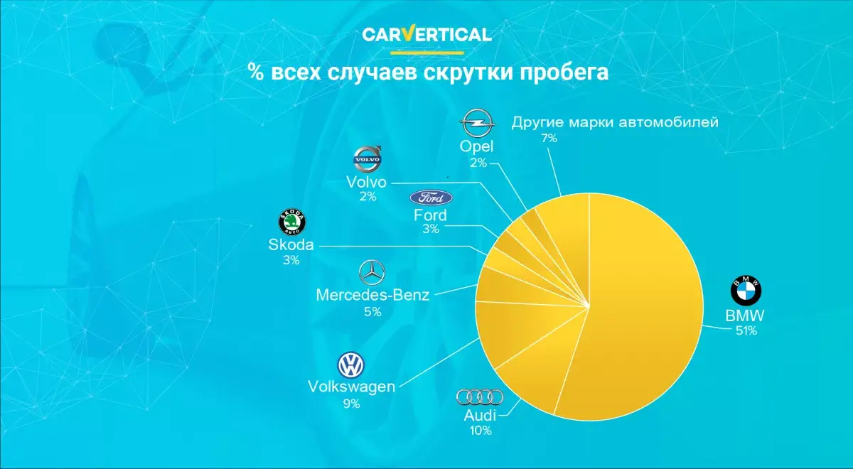 Как видно из приведенной выше диаграммы, наиболее покупаемые бренды страдают от скрутки пробега чаще, а подержанные автомобили BMW составляют более половины зафиксированных случаев.